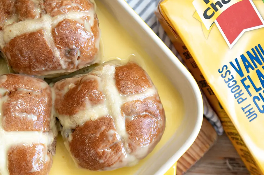 - Mix the First Choice Custard with the cornflour and pour the mixture into a piping bag to pipe crosses on each bun.